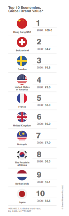 Several small and successful economies like Sweden, the Netherlands, and Malaysia emerge amongst the top ranks for economies that produce the most valuable brands.