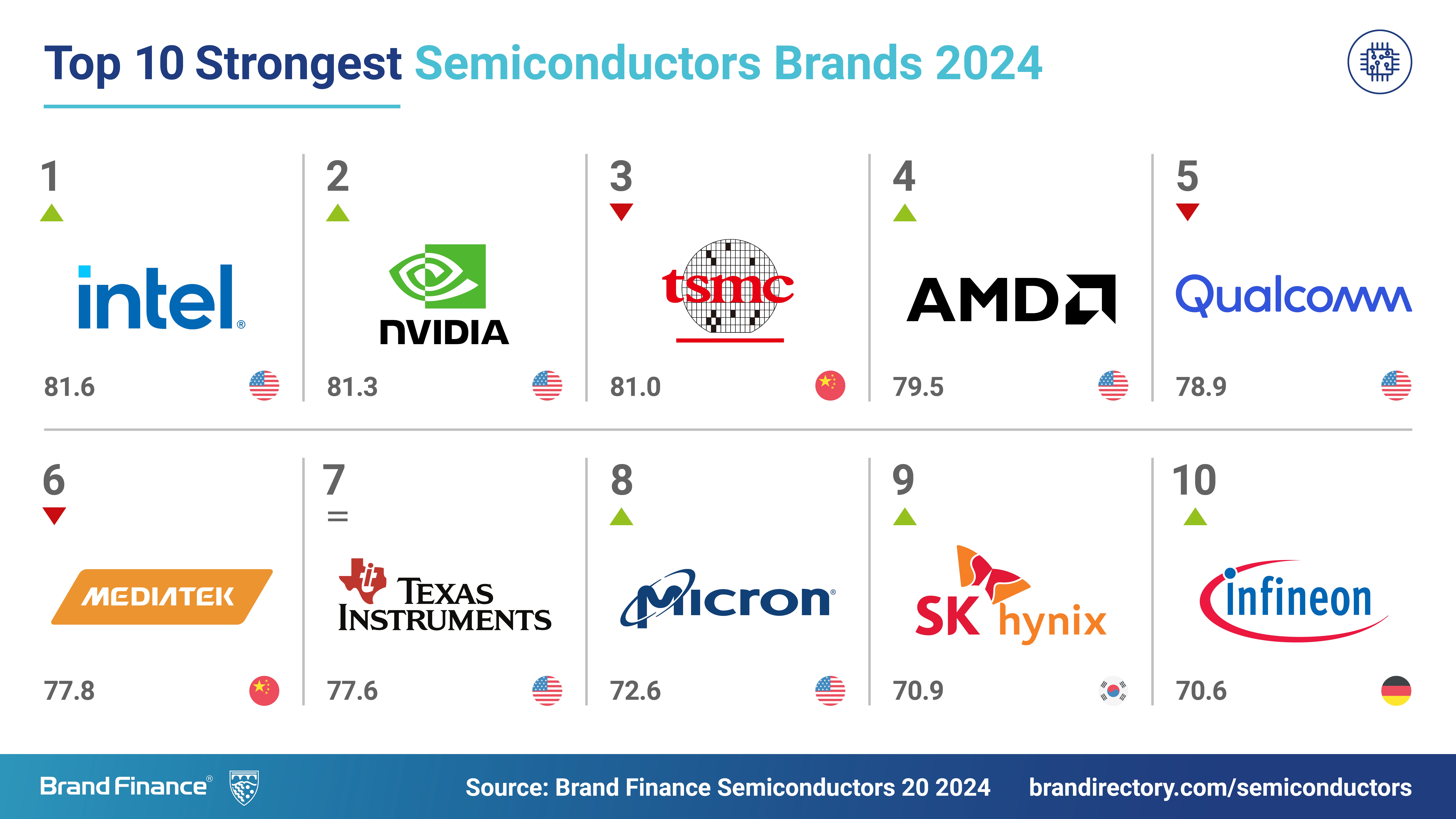 Intel maintains its status as the strongest semiconductor brand despite experiencing a 7% decrease in brand value to USD21.3 billion. While Intel's financial value has dipped, certain facets of its brand equity and operational efficiency have strengthened, with its Brand Strength Index score improving to 81.6/100. Brand Finance’s research found enhanced scores in value for money, familiarity, and consideration. It also revealed customers’ willingness to pay a premium for Intel products, underscoring the brand's resilience and customer loyalty amidst financial and operational challenges.