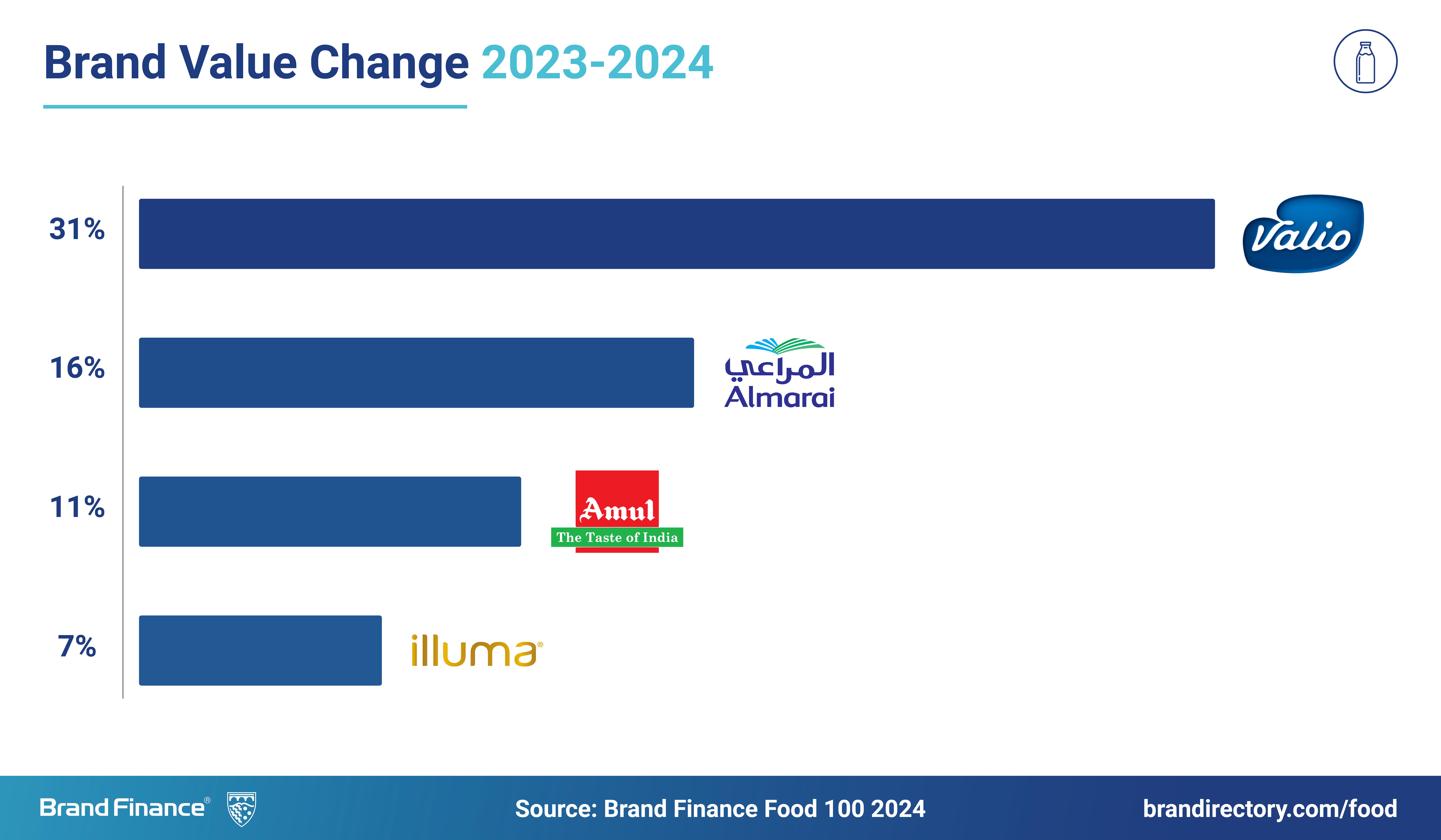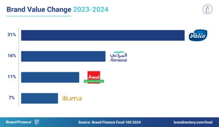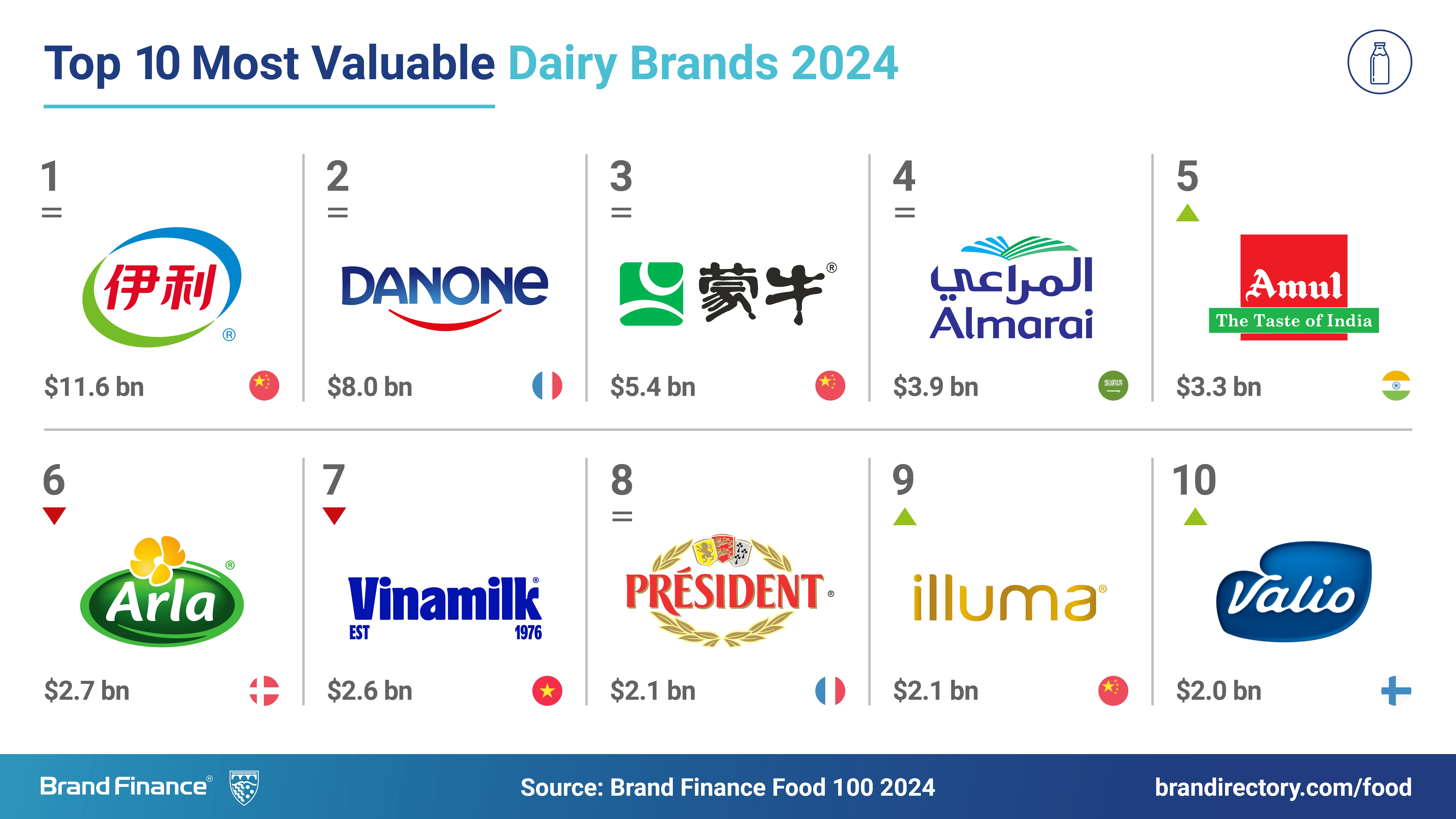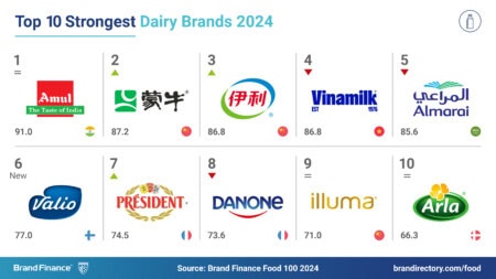 Valio (brand value up 31% to USD2 billion) makes a notable entry into the ranking this year, climbing four spots to secure the 10th position and earning the title of the fastest-growing dairy brand. This impressive growth is primarily attributed to the acquisition of Planti, a Finnish producer of plant-based dairy alternative products. With this acquisition, Oddlygood, a subsidiary of Valio, becomes the market leader in plant-based dairy alternative snacks in Sweden and dairy alternative cooking products in Finland.