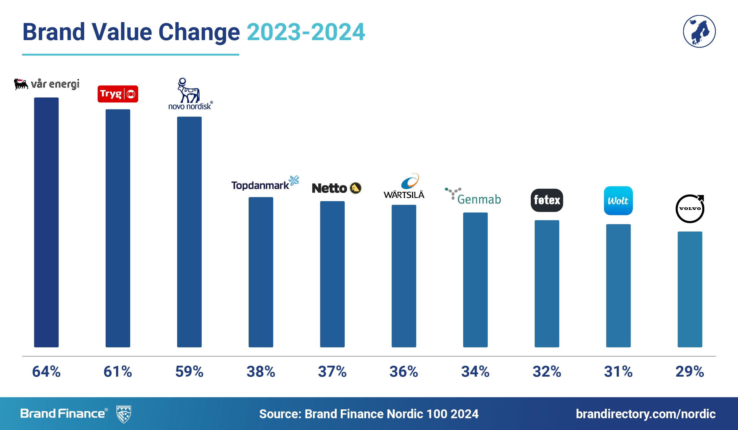 LEGO is the strongest brand in the Nordic region, achieving a BSI score of 87.9 out of 100, up by 1.9 points year-on-year, earning it an AAA brand rating. In Brand Finance’s research, LEGO excels in familiarity, satisfaction, and consideration, bolstered by decades of brand equity and nostalgia that resonate globally. LEGO's brand value has also increased by 3% to EUR 7.4 billion, making it the sixth most valuable brand in the region and the most valuable brand in Denmark. Novo Nordisk has become one of the Nordics’ top ten most valuable brands (eighth), following a 59% surge in brand value to EUR4.7 billion. This growth is largely fuelled by rising demand for its diabetic and weight loss medications, Wegovy and Ozempic, which have boosted both revenue and future forecasts, plus elevated the company's international profile. Vår Energi is the fastest-growing brand in the Nordic region, up 64% to EUR612 million, followed by Tryg (brand value up 61% to EUR1.5 billion).