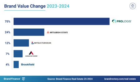 Experiencing a remarkable 53% surge in combined brand value, totalling USD10.3 billion, the total value of US brands which made the top 25 most valuable real estate brands in our rankings are led by Prologis as the standout performer, with its brand value skyrocketing by 75% to USD1.7 billion. US real estate brands now contribute 13% to the total brand value of the top 25 rankings, demonstrating resilience amidst the thriving e-commerce industry, which boosts income for logistics warehouses.