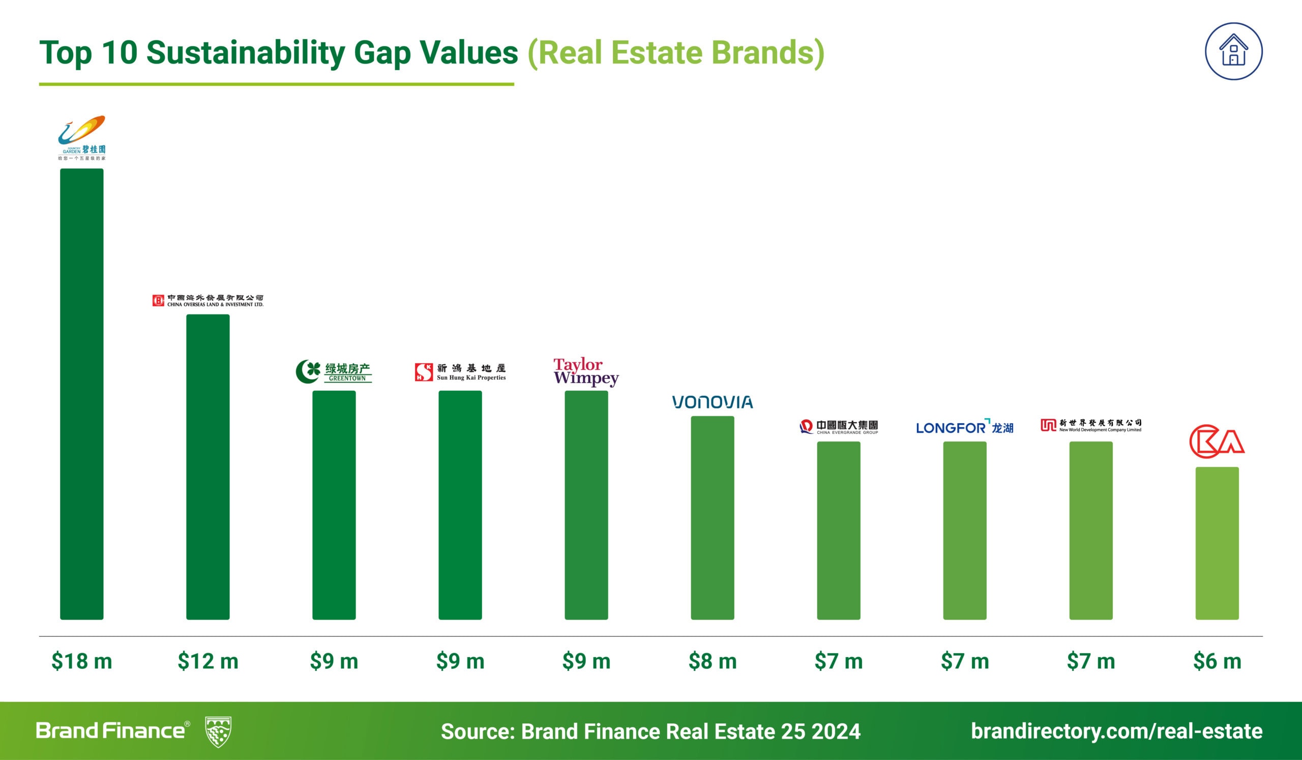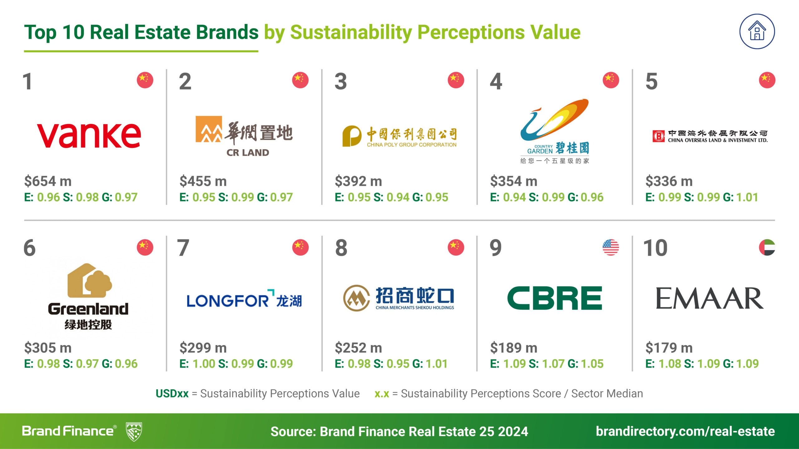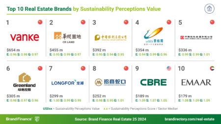 The Index displays the proportion of brand value attributable to sustainability perceptions for individual brands. This Sustainability Perceptions Value is the financial value contingent on a brand’s reputation for acting sustainably. From here, Brand Finance’s perceptual research is analysed alongside CSRHub’s environmental, social and governance (ESG) performance data to determine a brand’s ‘gap value’. This is the value at risk, or value to be gained, arising from the difference between sustainability perceptions and actual performance. The 2024 Sustainability Perceptions Index finds that in the real estate sector, Vanke has the highest Sustainability Perceptions Value of USD654 million.
