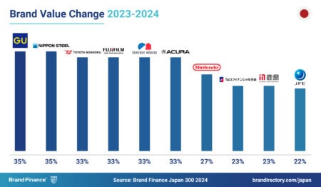 • Nippon Steel (brand value up 35% to USD3.8 billion) is the country’s second fastest-growing brand ranked, followed by TOYOTA BOSHOKU (brand value up 33% to USD997 million), rounding up the podium