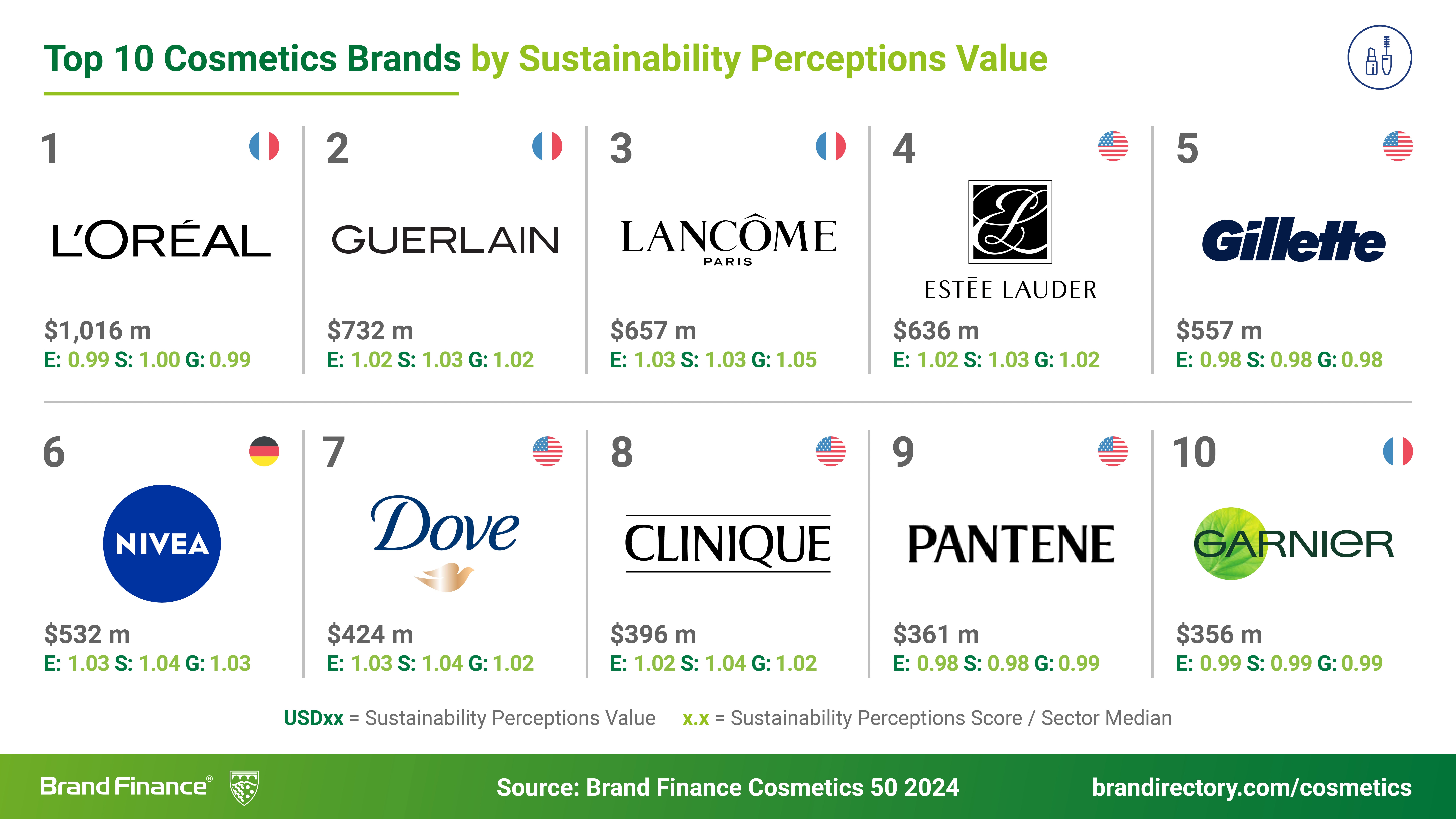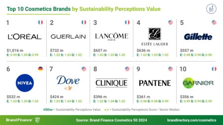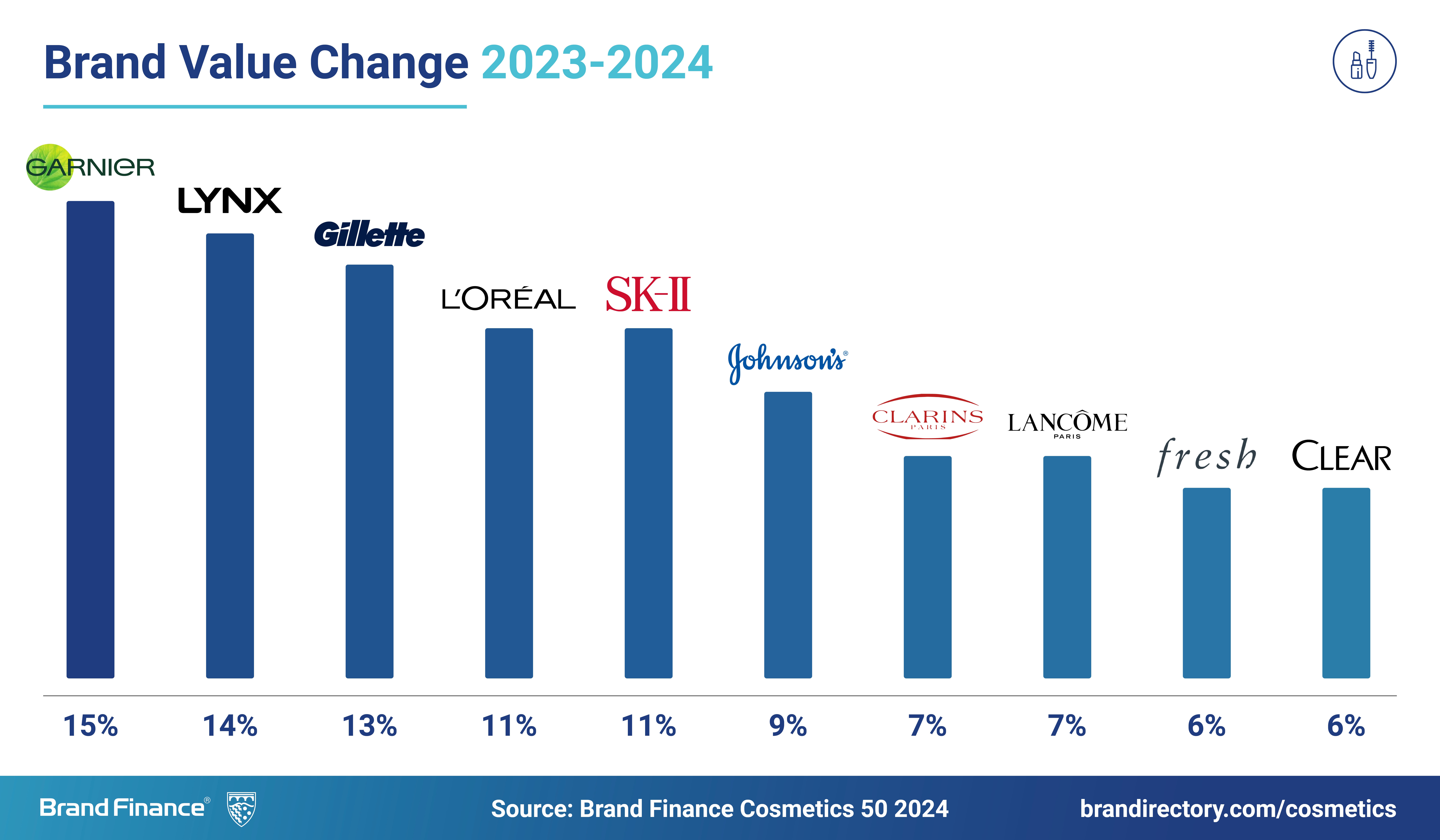 In der weltweiten Brand Finance Rangliste gibt es erhebliche Verschiebungen unter den Top-5-Marken der Schönheitsindustrie. Gillette (Markenwert stieg auf hohem Niveau um 13% auf 7,4 Mrd. US$) kletterte damit um zwei Plätze nach oben, während Estee Lauder (Markenwertverlust um 24% auf 5,4 Mrd. US$) und Dove (Markenwertverlust um 17% auf 5,4 Mrd. US$) die Top 5 verließen und Platz für die Neueinsteiger Guerlain (Markenwert um 1% auf 6,25 Mrd. US$) und Lancôme (Markenwert um 7% auf 5,6 Mrd. US$) machten.
