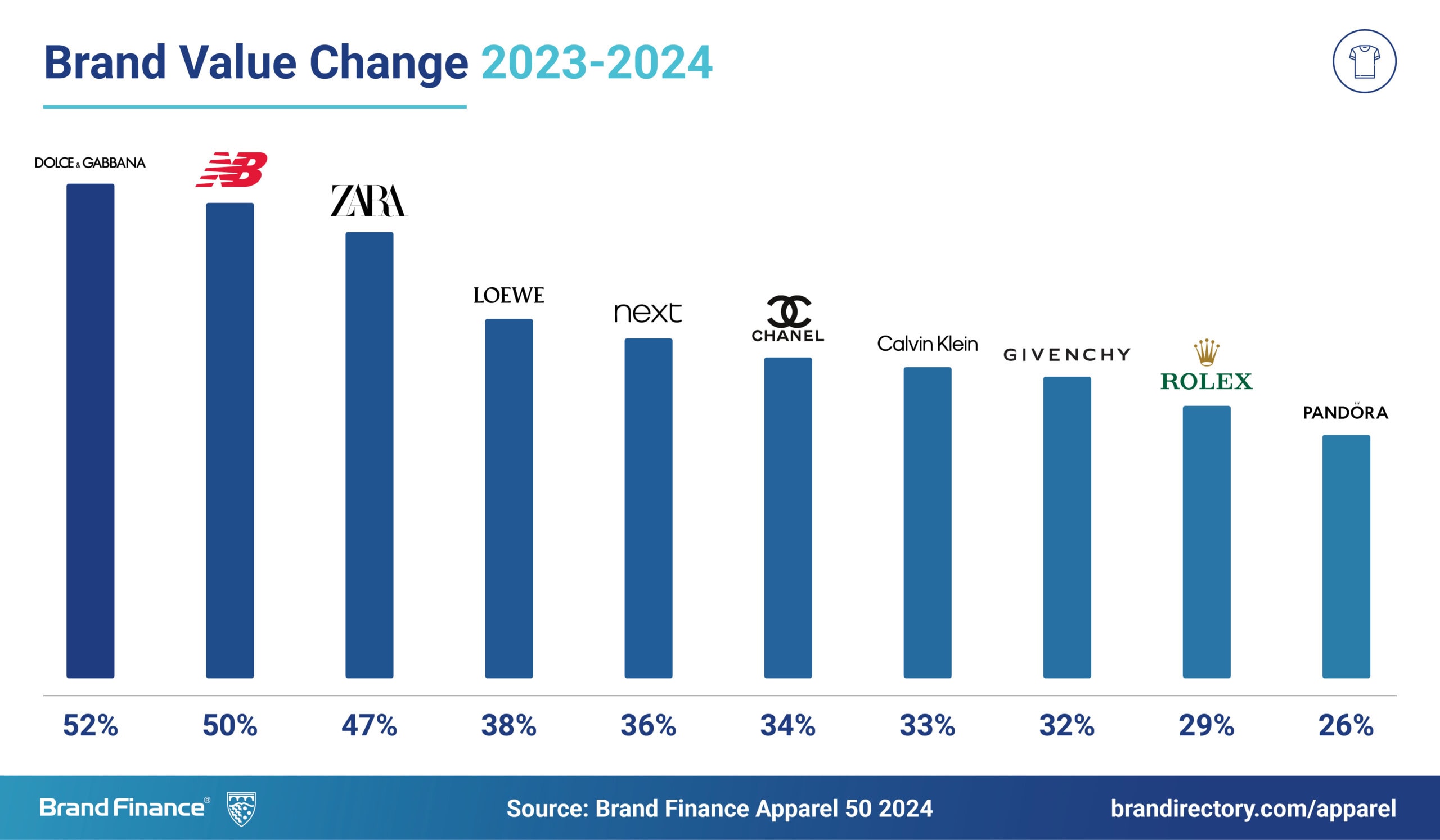 Dolce & Gabbana has emerged as the fastest-growing apparel brand ranked by percentage, with a remarkable 52% increase in brand value to USD2.1 billion. This growth marks a significant turnaround for the brand, which has successfully rebuilt its reputation and expanded its portfolio, including its foray into luxury real estate.