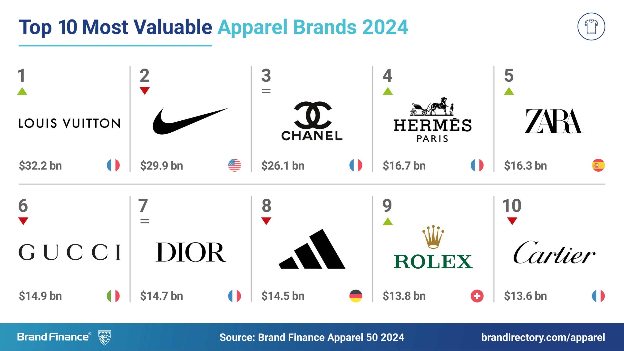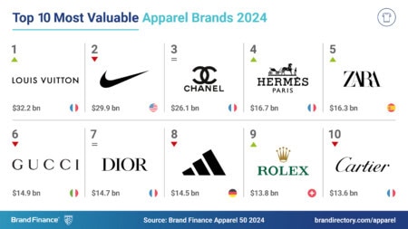 Louis Vuitton (brand value up 23% to USD32.2 billion) has claimed the top spot as the world’s most valuable apparel brand ranked by Brand Finance in 2024. The brand's strong performance is driven by a robust recovery in the Chinese market and innovative collaborations, including a high-profile partnership with Japanese artist Yayoi Kusama. Louis Vuitton’s sustained growth is further supported by its exceptional brand loyalty and consumer willingness to pay a premium for its products.