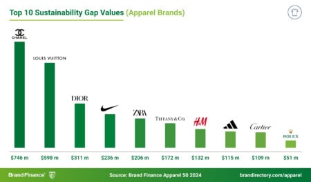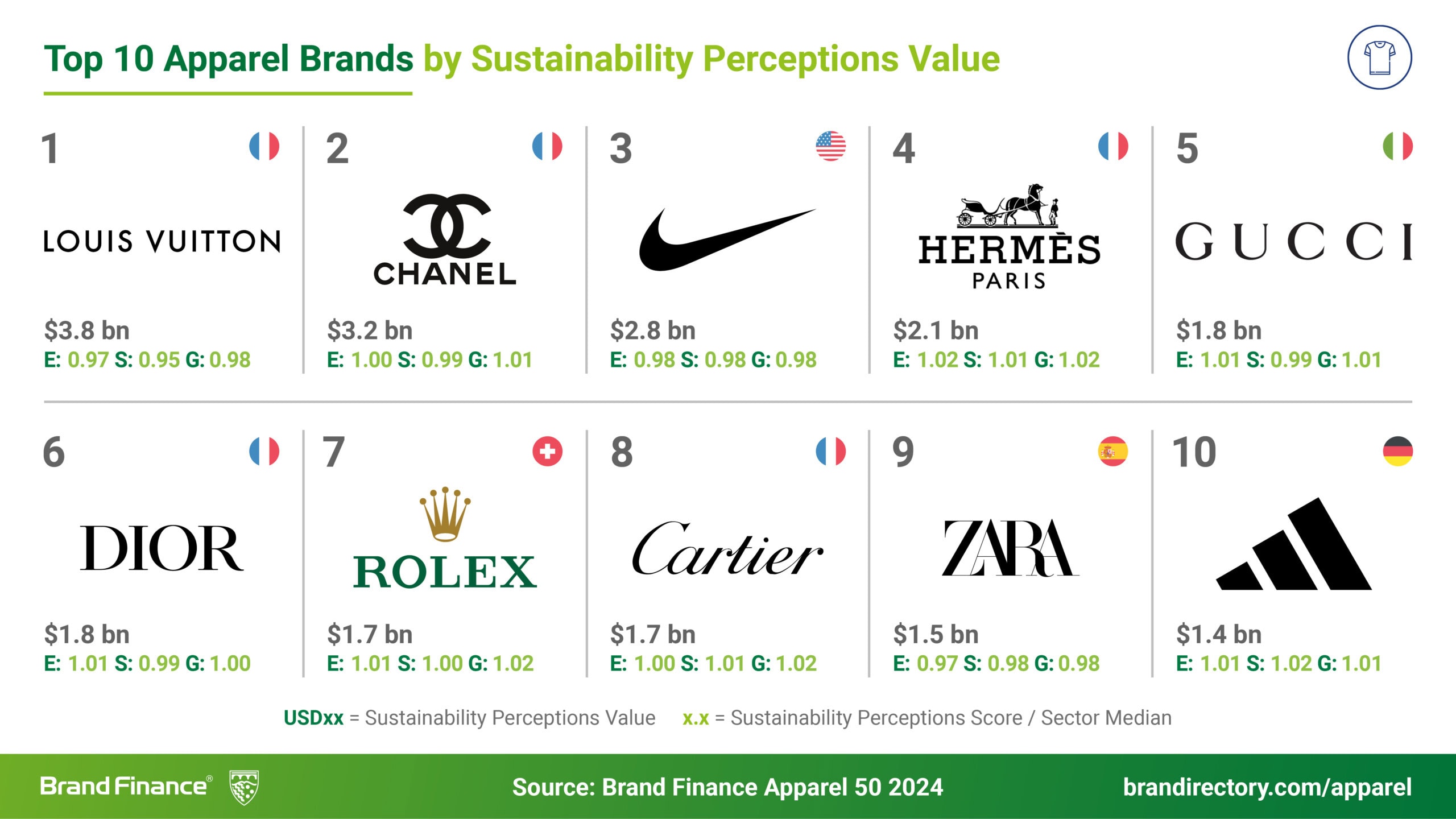 The 2024 Sustainability Perceptions Index finds that Louis Vuitton tops the ranking in the apparel sector, with a value of USD3.8 billion and Chanel has the highest positive gap value of USD746 million among brands in the rankings.
