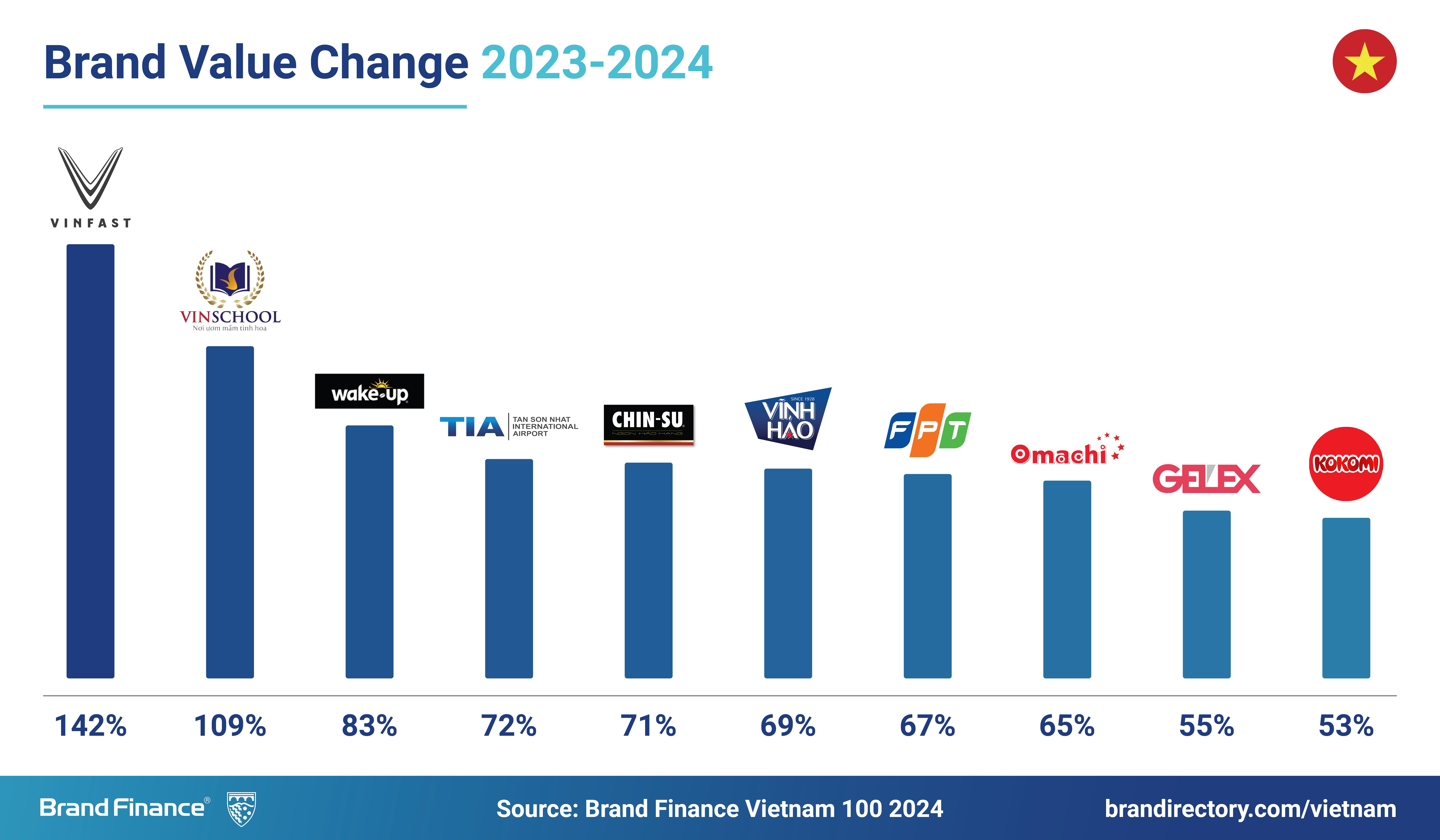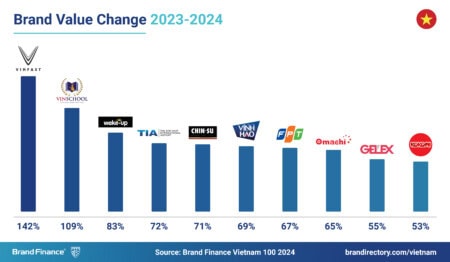 Vietnam’s three largest brand value gainers from different sectors added momentum to its decelerating economy forecasted this year, surpassing expectations with growths of at least 83%. VinFast’s 142% brand value growth to USD181 million makes it Vietnam’s largest brand value performer, with the brand having a comfortable lead over runners-up Vinschool (brand value up 109% to USD45 million) and Wake-up 247 (brand value up 83% to USD149 million).