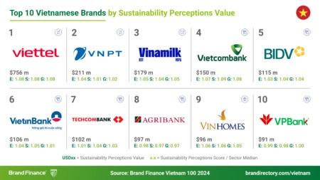 The 2024 Sustainability Perceptions Index finds that among brands in the rankings, Viettel has the highest Sustainability Perceptions Value of USD756 million.