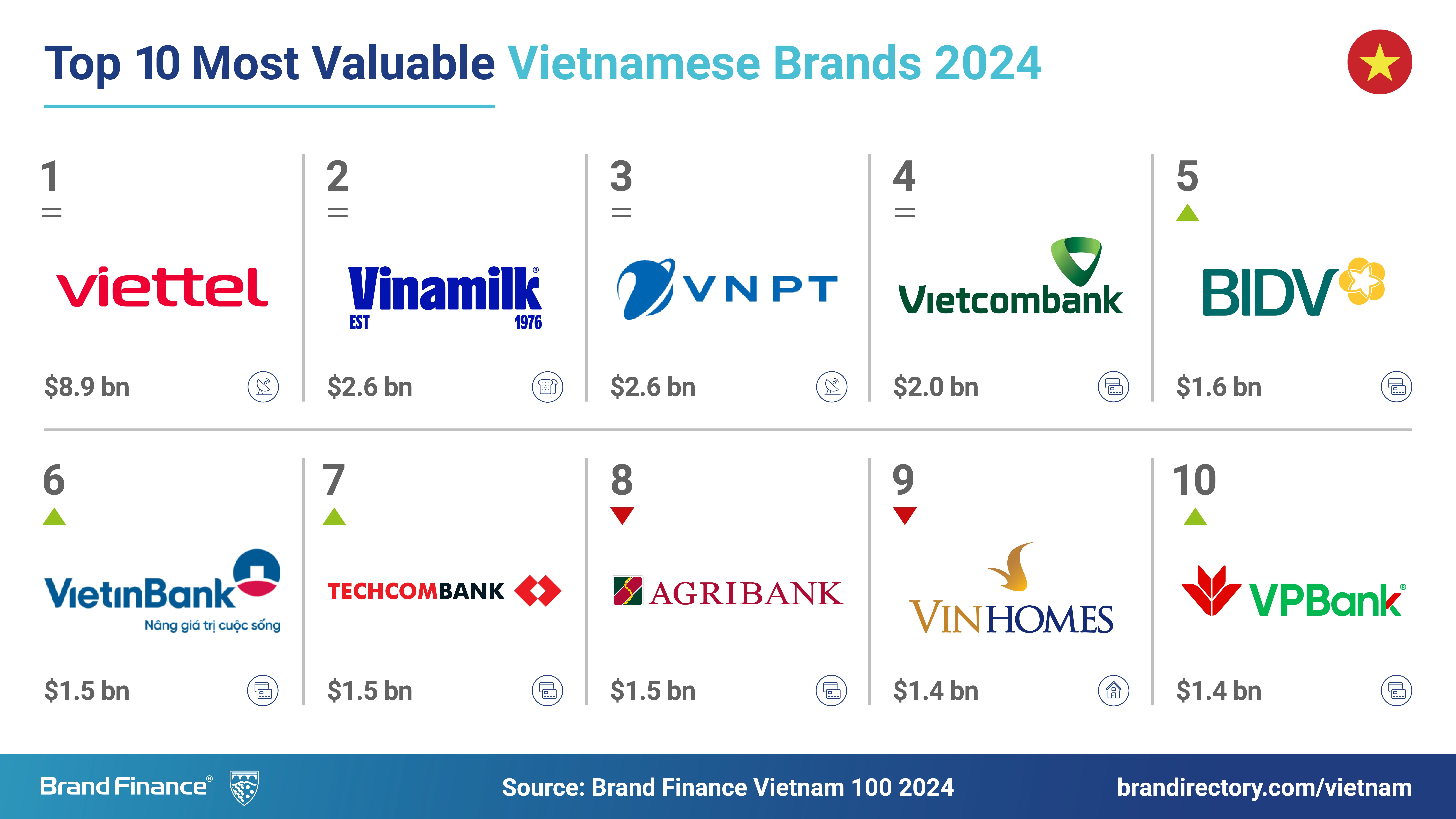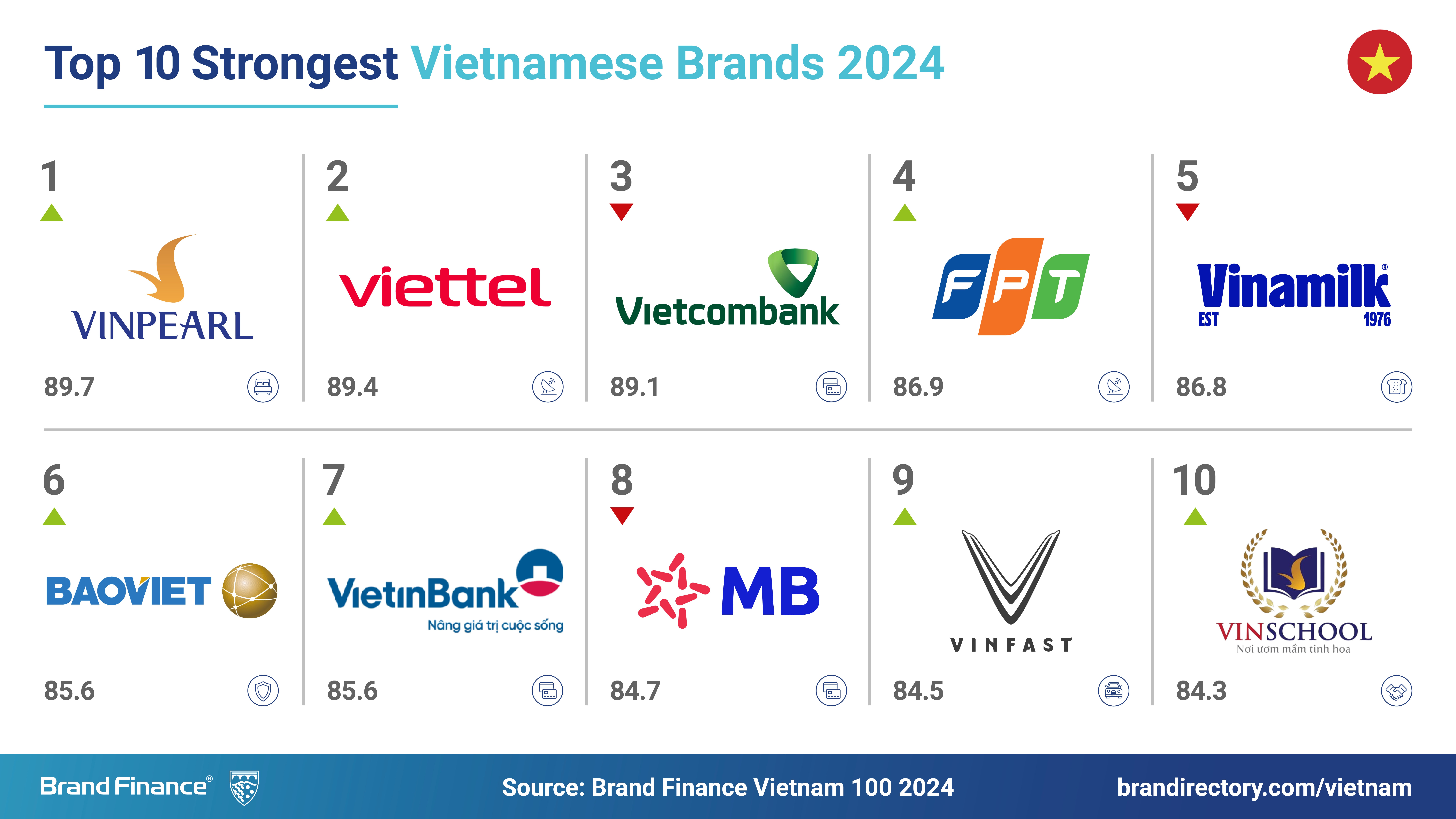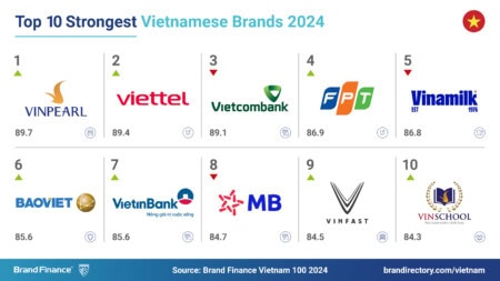 The strongest brand in this year’s rankings is Vinpearl (brand value up 34% to USD230 million), followed by Viettel and Vietcombank. Vinpearl and Vietcombank swapped places from last year’s ranking of the nation’s strongest brands among the 100 most valuable. Viettel advanced three places from fifth strongest brand last year, succeeding MB (brand value up 6% to USD853 million) which placed second strongest in 2023.