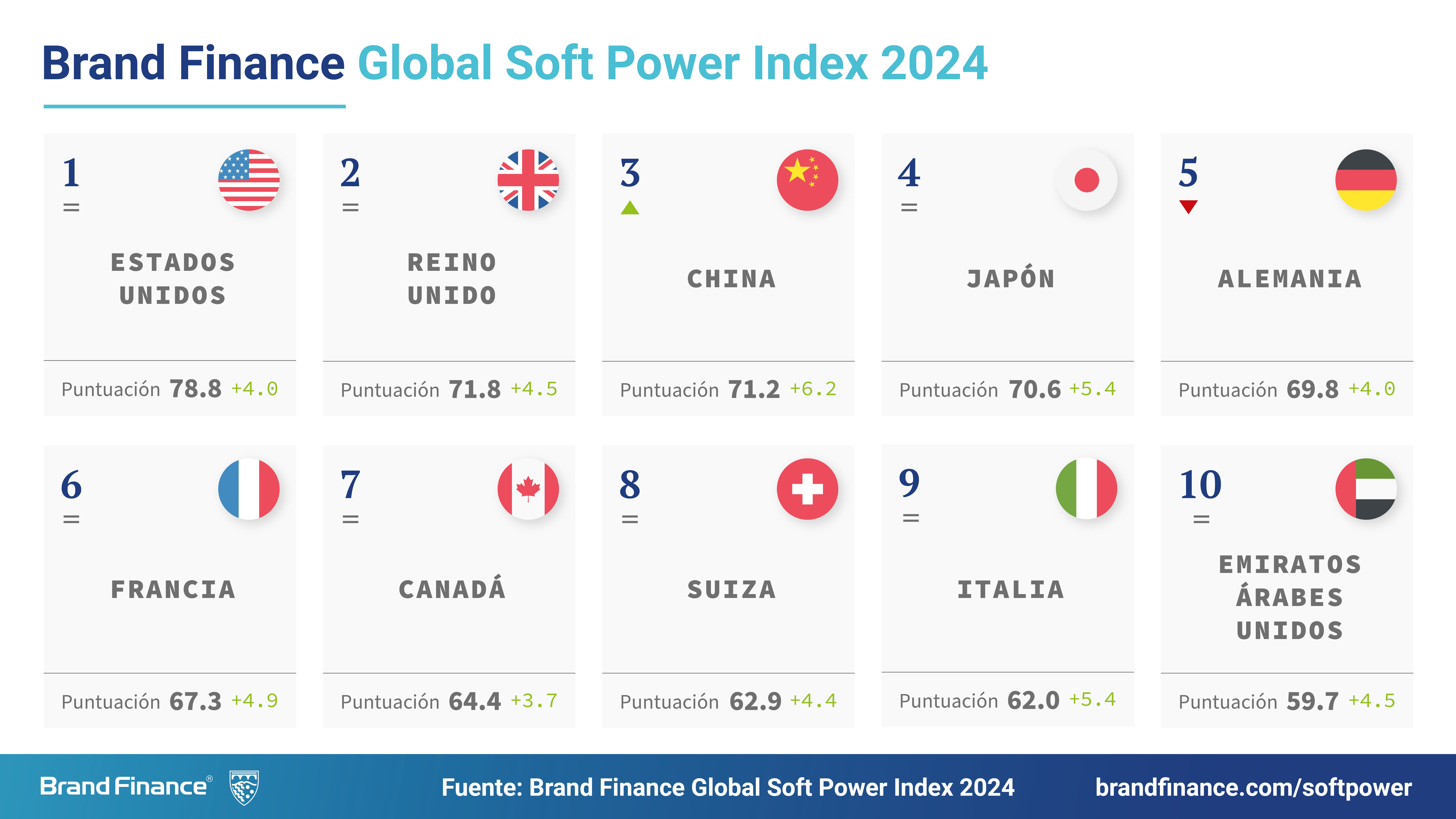 Der Bericht kommt zu dem Ergebnis, dass in einer Zeit zunehmender globaler Unsicherheit und Instabilität die ökonomische Glaubwürdigkeit immer mehr zur Soft Power einer Nation beiträgt. Nationenbezogene Markenattribute wie "starke und stabile Wirtschaft" und "Produkte und Services die die Welt liebt" erweisen sich als wichtige Triebkräfte für Einfluss und Ansehen auf der globalen Bühne. Dieser Trend erklärt die anhaltende Dominanz der größten Volkswirtschaften der Welt wie den USA und China sowie kleinerer Volkswirtschaften wie der Schweiz und den Vereinigten Arabischen Emiraten an der Spitze der Rangliste. Dominante Nationenmarken verzeichnen ein schnelleres Soft-Power-Wachstum (durchschnittlich +3,1 Punkte in den Top 50) als der Rest der Rangliste (durchschnittlich -1,3 für die Plätze 51-193).